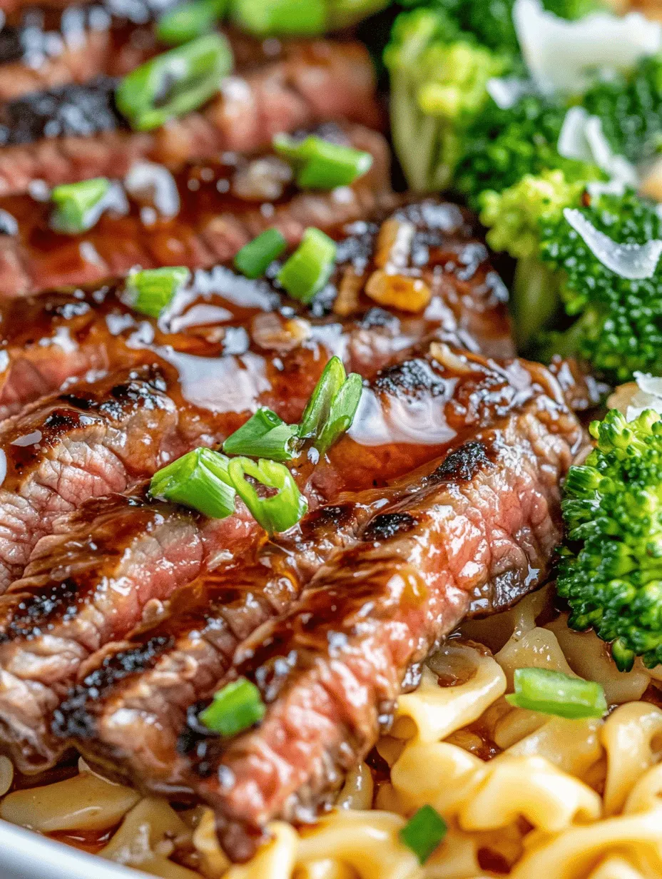 Sticky Honey Garlic Steak and Rotini is a standout dish that combines the savory and sweet elements of grilled flank steak with the comforting richness of pasta. The vibrant colors of the broccoli and garnishes not only enhance the visual appeal but also contribute to the dish’s overall flavor profile.